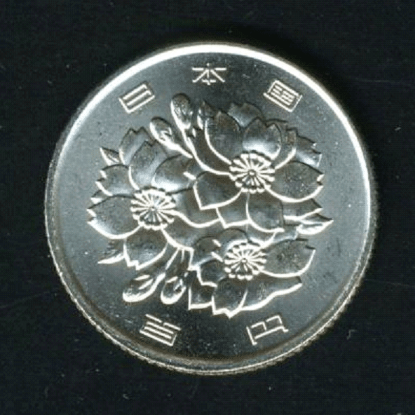 1. A moeda de 100 ienes tem o desenho de flores de cerejeira! Em cima do sakura está escrito 日本国 (Japão) e embaixo, 百円 (100 ienes). Conseguem identificar?